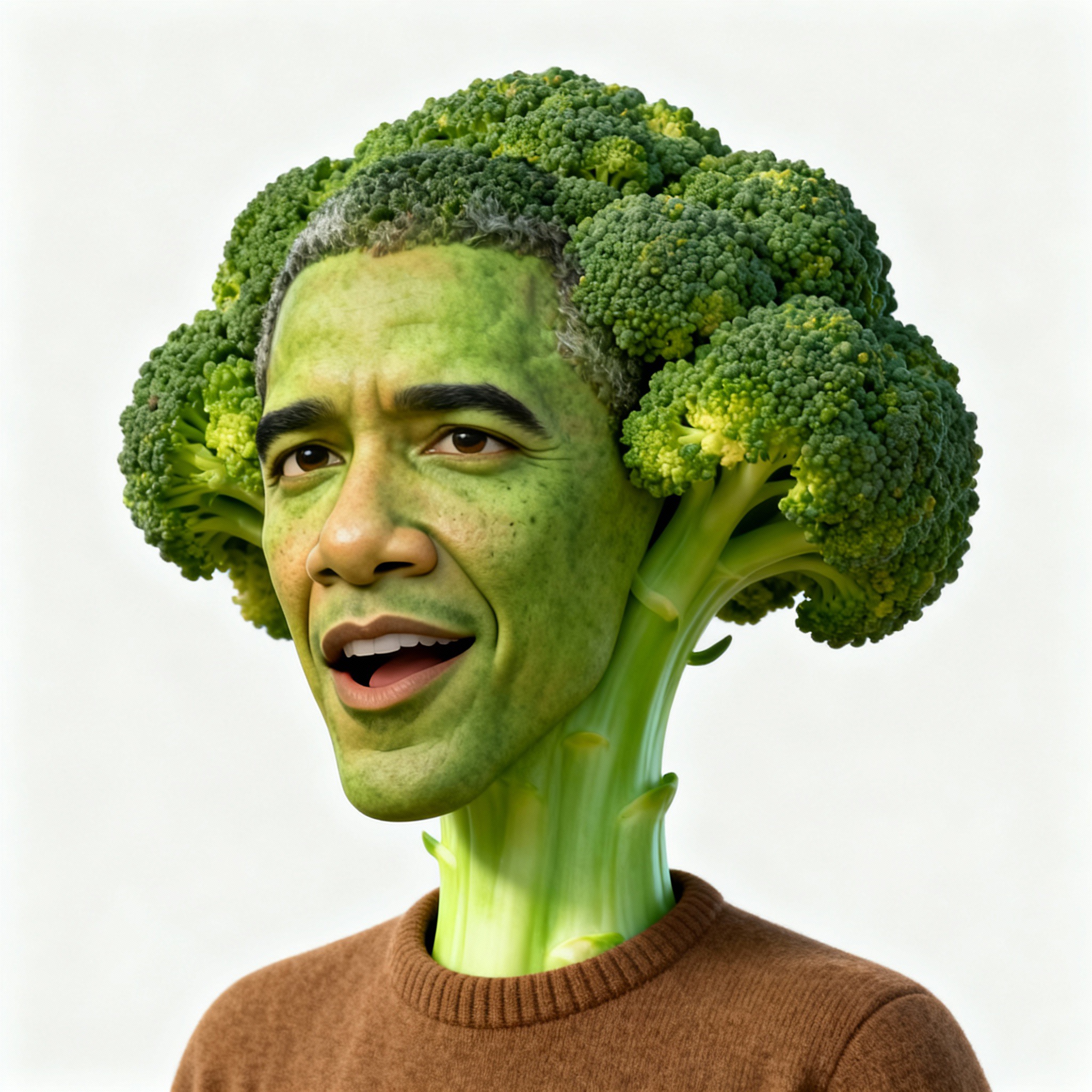 Response: “Portrait of Barack Obama reimagined as ‘Baroccoli Obama’: his entire head shaped like a single broccoli floret, not a human skull with broccoli on top. Skin is shades of broccoli green, with floret-like texture where his hair would be. Neck is a smooth broccoli stalk that transitions naturally into an earth-tone brown sweater. Eyes and mouth are fairly realistic and clearly recognizable as Obama, but overall style is midway between realistic and cartoony, with soft studio lighting and a simple neutral background.”